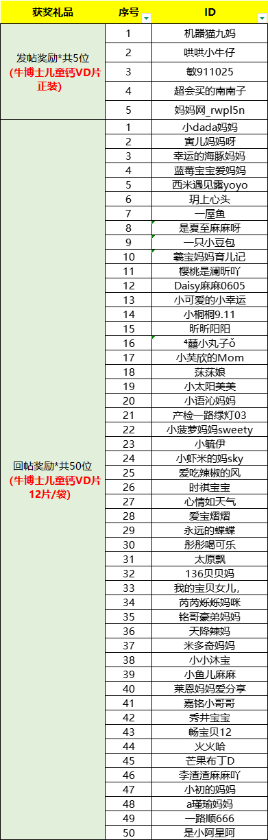 感谢大家真挚的、用心的、暖暖分享,小编看了所有的帖子都很感动哦!我们评选了50篇优质回帖和5篇优质发帖,奖励用户如下,以下宝妈看到名单快查看短信给小编发地址哦!